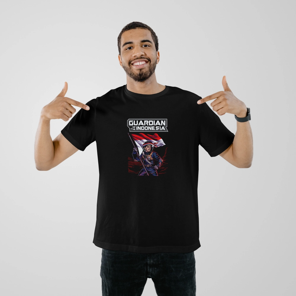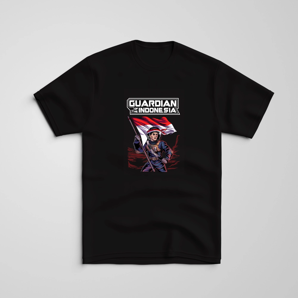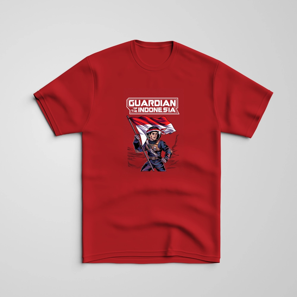 Sebuah alegori visual tentang semangat perjuangan yang tak lekang oleh waktu. Desain ini menghadirkan sosok “Guardian of The Indonesia”—seorang figur pahlawan modern yang digambarkan dalam balutan seragam futuristik dengan nuansa militer dan astronot. Dengan gagah, ia mengibarkan bendera Merah Putih, simbol keberanian dan pengorbanan yang sudah melekat dalam sejarah bangsa.
