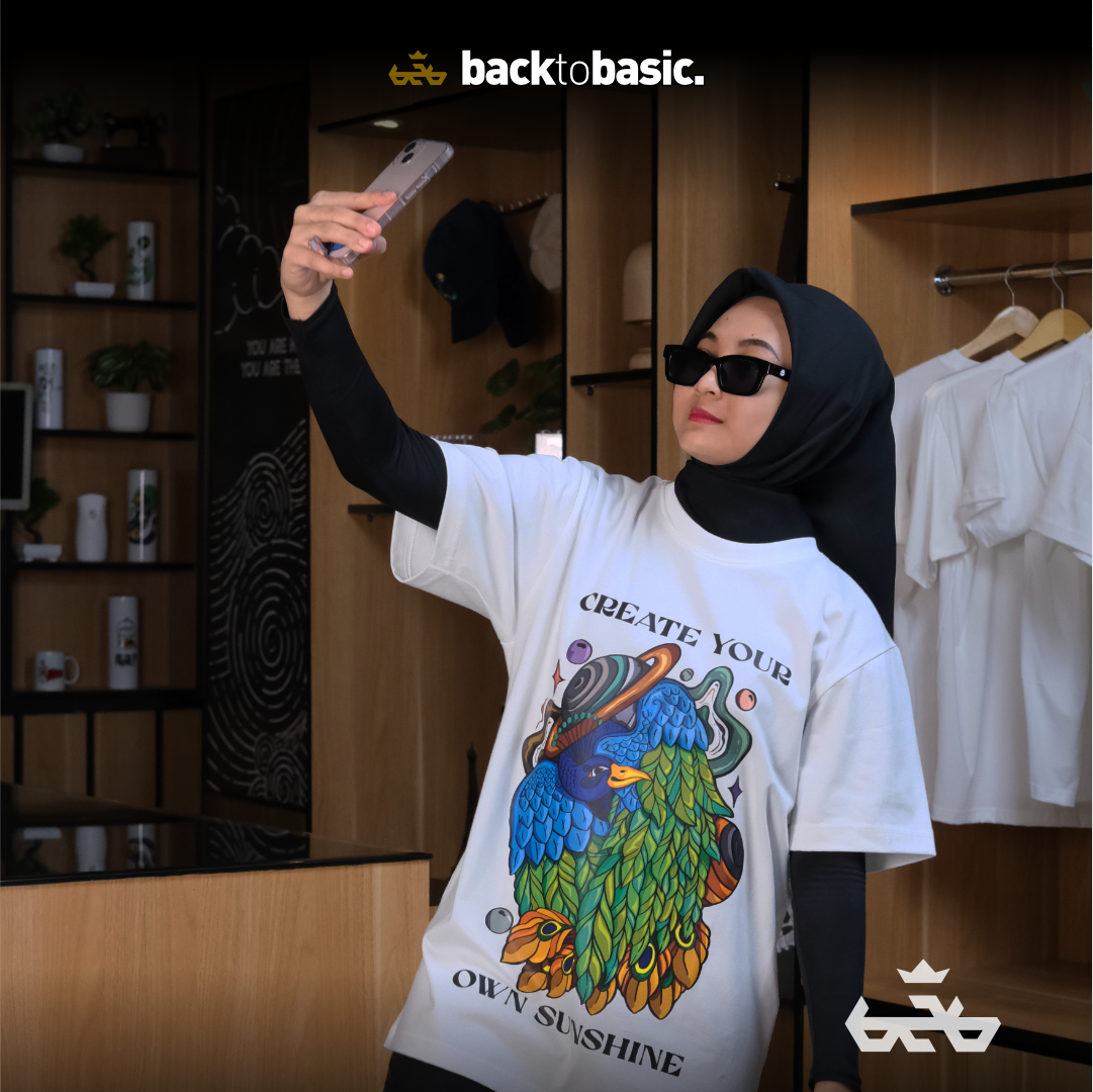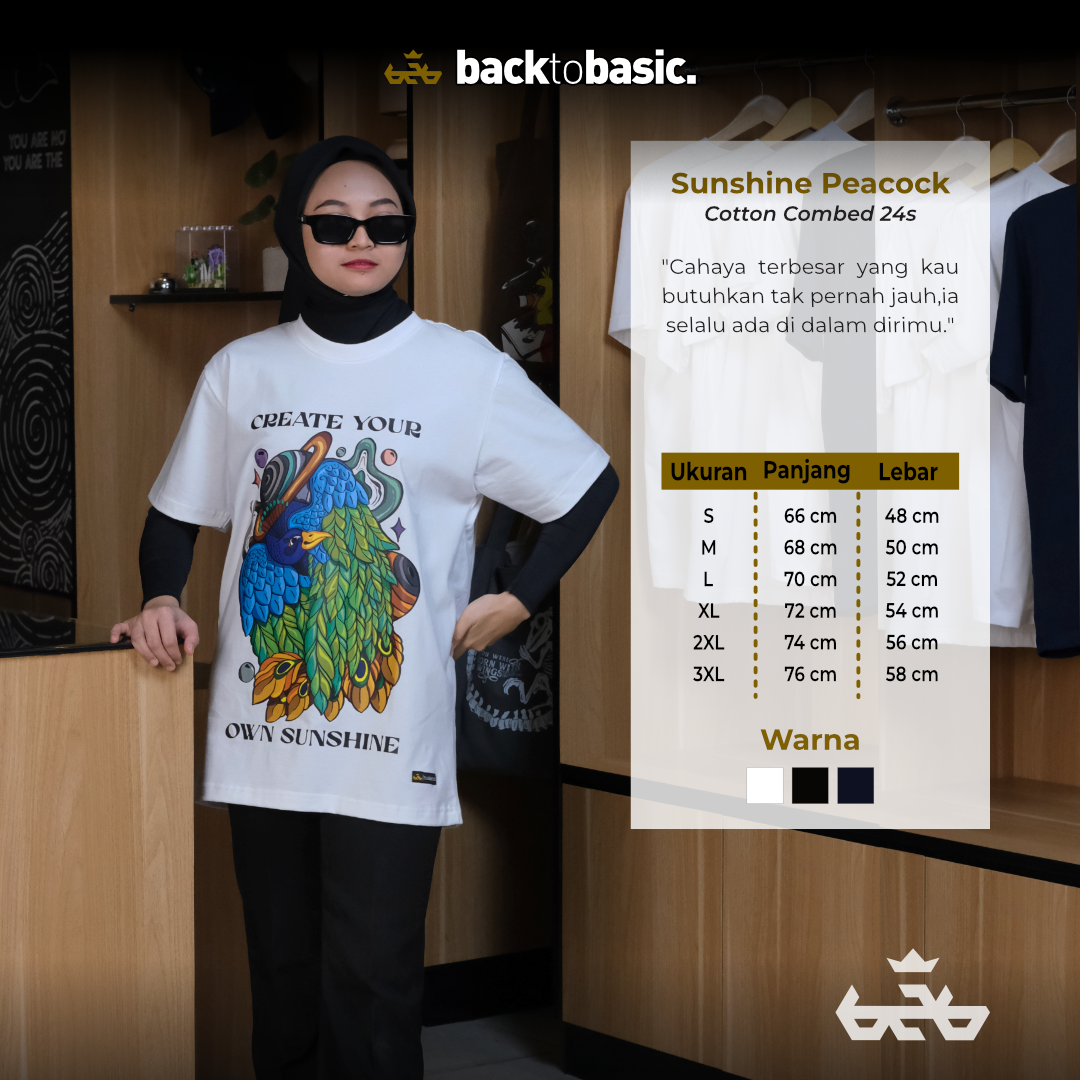 Kaos koleksi khusus dengan desain eksklusif bertema Sunshine Peacock, memadukan simbol keanggunan merak dengan pancaran cahaya yang penuh percaya diri. Sebuah representasi dari keindahan diri yang tak perlu disembunyikan, dan keberanian untuk tampil bersinar di tengah dunia. Terbuat dari katun premium yang lembut dan menyerap keringat, nyaman dipakai sehari-hari. Potongan reguler yang simpel namun tetap stylish, cocok untuk kamu yang ingin tampil berani dengan pesona alami.
